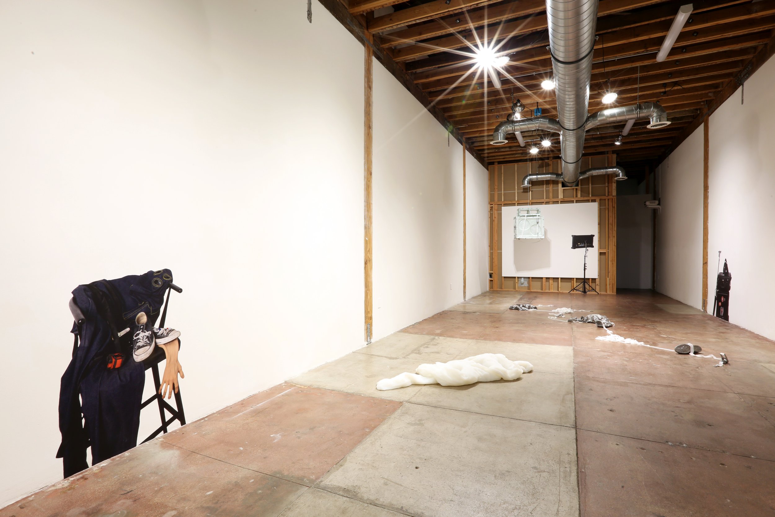 In the front room, sculptural installations further explore these themes. A fiberglass amplifier hangs from the ceiling, held by silicone ratchet straps, while cast aluminum clothing lies on the floor. Beneath the amplifier, an opaque silicone figure, an interior void, weighty in its objectness yet somehow empty . Photographic wallpaper transfers on the walls show images from the video production, blurring the line between the gallery as a viewing space and the gallery as a production environment.
